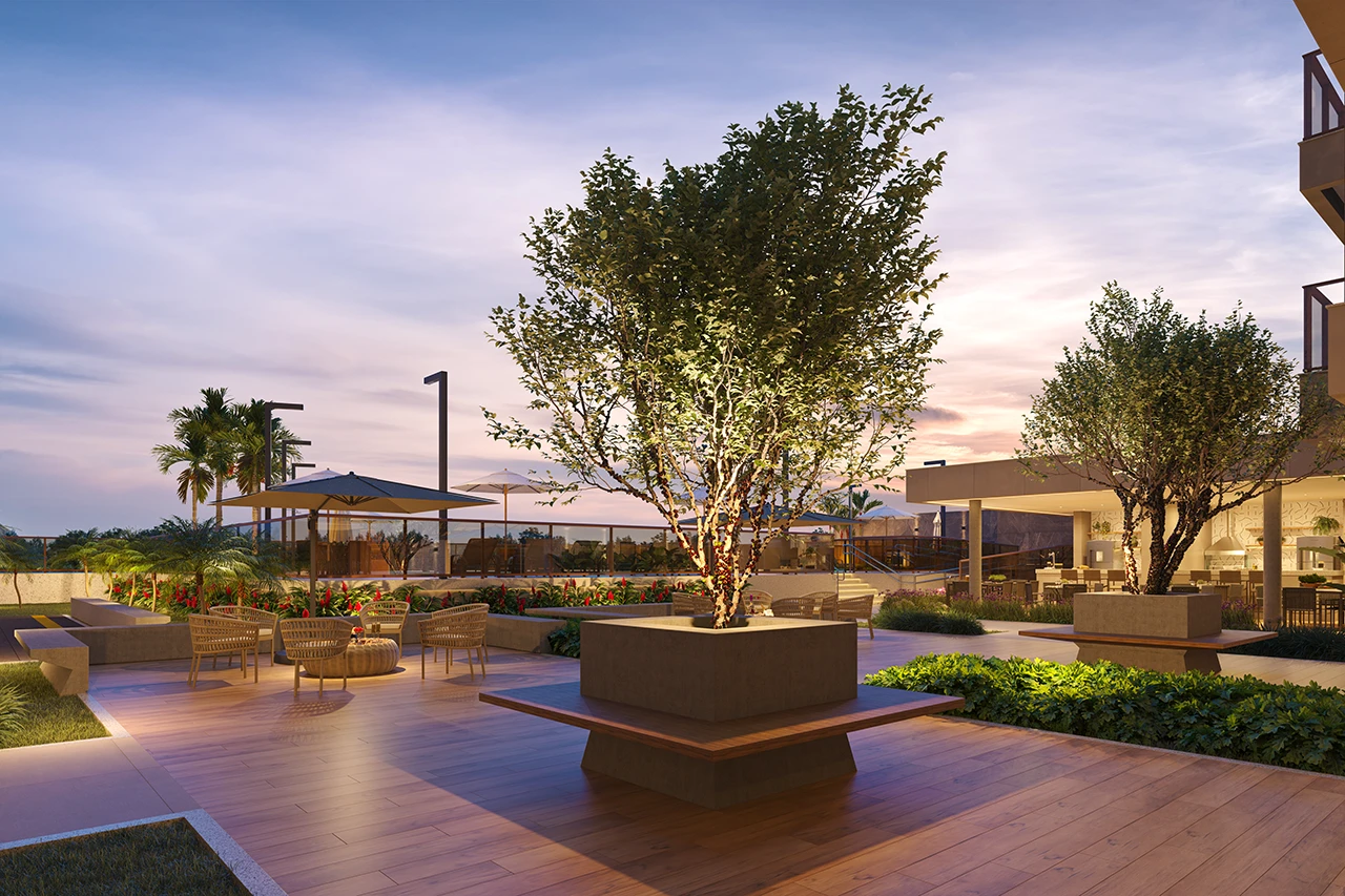 As imagens são meramente ilustrativas. Todos os itens que compõem o projeto serão entregues conforme memorial descritivo do empreendimento e respectivo compromisso de compra e venda de unidade autônoma. Materiais, vegetação e mobiliários poderão sofrer pequenas alterações conforme disponibilidade de mercado. Na entrega do empreendimento a vegetação poderá apresentar diferenças de tamanho e porte, mas estará de acordo com o projeto paisagístico. RI: R15-145019